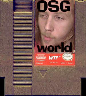 That's right, kids. I've finally decided to show you the crown jewel in my collection of NES games. This is the world's rarest NES game, OSG world. In 1989, WTF co. produced a game based on me! I wrote them a letter, saying that they should try their hand at making video games. They were so moved by the idea that they invited me to their headquarters in Colorado Springs, CO. They got me to write the plot of the game, and I helped a little with the coding and graphics. I was paid a buck and a quarter per hour for my labours. Of course, when we sent the prototype into Nintendo, they told us we had to take out the sexually explicit parts, and all of the swearing. As you can imagine, that only took most of the plot away from the game. Now it's just me looking for Billy Idol. Of course, that's me on the sticker. We had a 7 hour photo shoot. That was the best picture. Honest. |