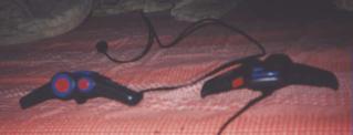 This is a shot of my two Boomerang controllers. They're actually pretty good, except for the fact that the select button is hard to press in mid-game. Or is that the start? Whichever one is on the top. Squint. You can see a blue button up there. Tip: Do NOT use the boomerang controller to play The Legend of Zelda. Over excitement can cause you to throw the boomerang controller, thinking you are Link and it actually is the boomerang. |