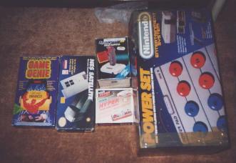 This is a boring shot of some various boxes I have. This is nothing special, really. I'm positive that the only box here that's maybe even worth a little bit is the Shinsei Hyper Controller box, or maybe the Quickshot XII controller. The yellow sticker on the NES Satellite means "buyer risk" (the store didn't test it). The brown stuff on the NES Power Set box is packing tape. The box was like that when I got it. |