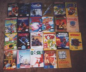 This is a group shot of all my (unsealed) boxes. Not a lot, really. I'm pretty sure I have manuals for all the boxes. The gauntlet pictured is not the Tengen version. The red sticker on The Magic of Sheherazade is actually on plastic that's around the box. A sleeve, if you will. The white stickers on Wrestlemania and World Cup Soccer both show the price, and I'm afraid to peel them off. If you look closely, you can see "Doesn't work" on the Master Hu and the Drunkard Chu box, written in pen. Whatever. The game works. |